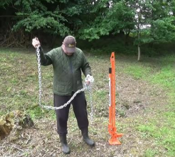 伐木工人在进行挖树桩的工作时,将一条链子和千斤顶连接起来,将千斤顶的一头插在树桩旁的土壤里,然后铁链子将树桩捆住,不断按压把手,慢慢将树桩一点点从土地面拔出来,通过千斤顶的作用力,几秒就可以将大树连根拔起,既节省了体力,又节省了人力。