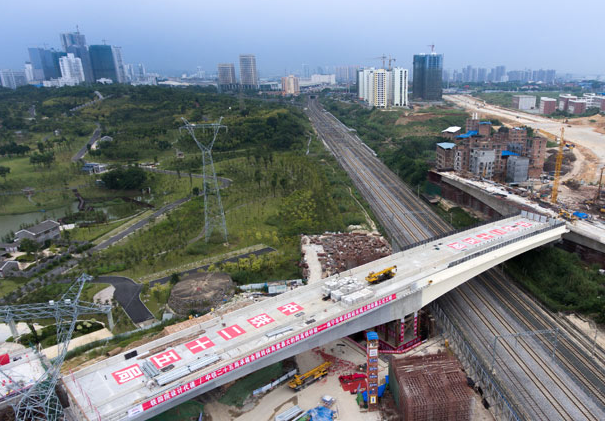 两座转体梁分别长98米、重9000吨,通过4台400吨连续牵引千斤顶的牵引,在20多米高的上空同步旋转,实现精准对接,完成了对京沪铁路和京沪高铁的跨越。此次桥梁转体的成功再一次展示了我国先进的基建工程技术。