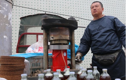 榨油的第一步就是准备原料,油的原料多种多样,可以是花生、油菜花籽、橄榄和向日葵等,不管是什么原料在准备好以后都要进行压榨才能出油。压榨时千斤顶下面是容纳原料的容器,上面是固定用的铁架,摇动手柄,慢慢给原料施加压力,这样油就被压榨出来。这样制作的油里面不添加任何化学物质,深受人们的欢迎。以前古法榨油都是在油饼两端人力增加木楔施加压力,既费时又费力。现在使用机器以后既提高了效率又提高了产量。