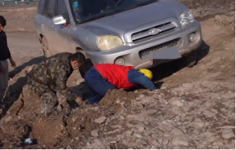 电力员工在结束巡线任务后途径此处,发现了被困车辆,了解完情况后立即拿上随车携带的千斤顶、铁锹等工具协助司机救援车辆。电力人员先是使用铁锹清理出了一块平坦的地面为设备放置提供空间,然后借用千斤顶将车辆顶升起来,经过半个多小时的共同努力,顺利将车辆救出。