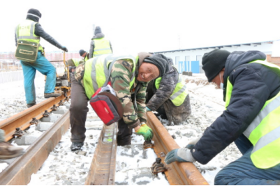 为确保施工工期,项目部组织人力,从去年12月上旬至今年1月中旬,克服严寒多雪等困难进行冬季施工,进行了大陆站至鹤岗南站以及站内共16.5公里的长轨换铺施工,完成换轨任务的53.2%,并于3月初正式开始鹤岗南站至鹤立站的长轨换铺施工。换轨时工人使用了齿条千斤顶代替撬棍完成了旧铁轨拆除以及新铁轨对接的作业,这种设备承重性能强、顶升稳定,给后续的对接提供了有利条件。