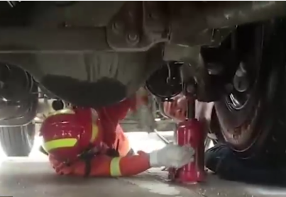救援人员赶到了解后得知,该挂车因在斜坡路段行驶时,车辆突然发生故障,该司机下车对其进行维修,因马虎大意未对车辆轮胎进行固定,导致溜坡被压车轮下,下半身被压在车辆的前车轮下。经过仔细查看后,消救援人员立即拿来枕木对车辆轮胎进行固定,防止其继续溜车,同时借助千斤顶将前车轮慢慢地撑起抬高,不断扩大救援空间。经过15分钟左右的紧张施救,成功将被压男子从车轮下救出。